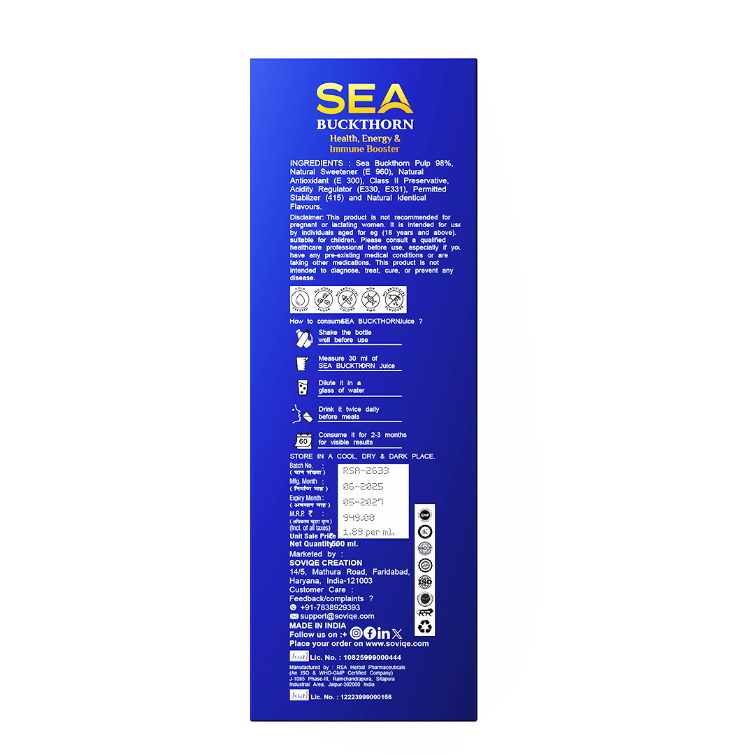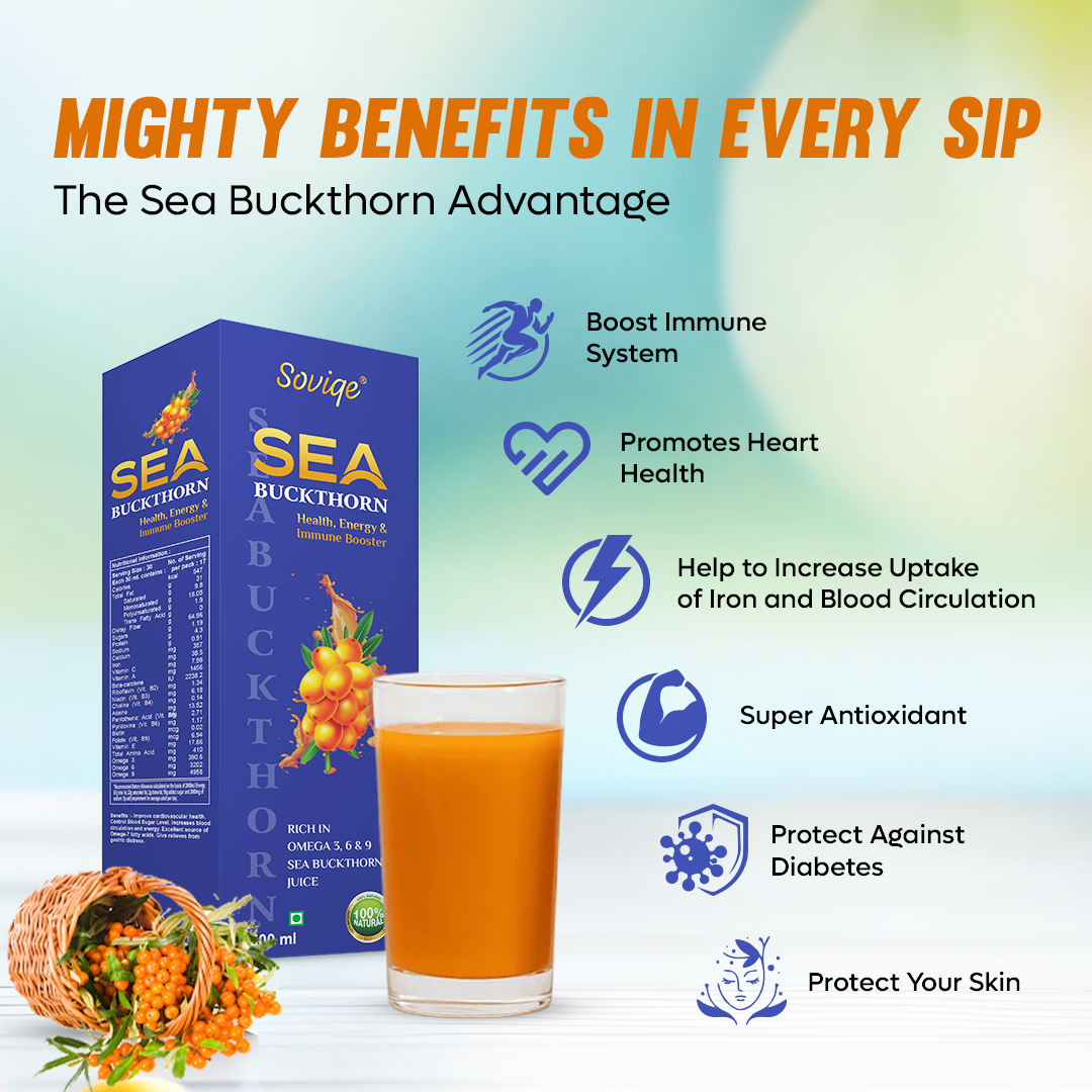 Made from pure, natural Sea Buckthorn berries, Soviqe Sea Buckthorn Juice (500ml) is your daily dose of nourishment for a healthier, more radiant you.